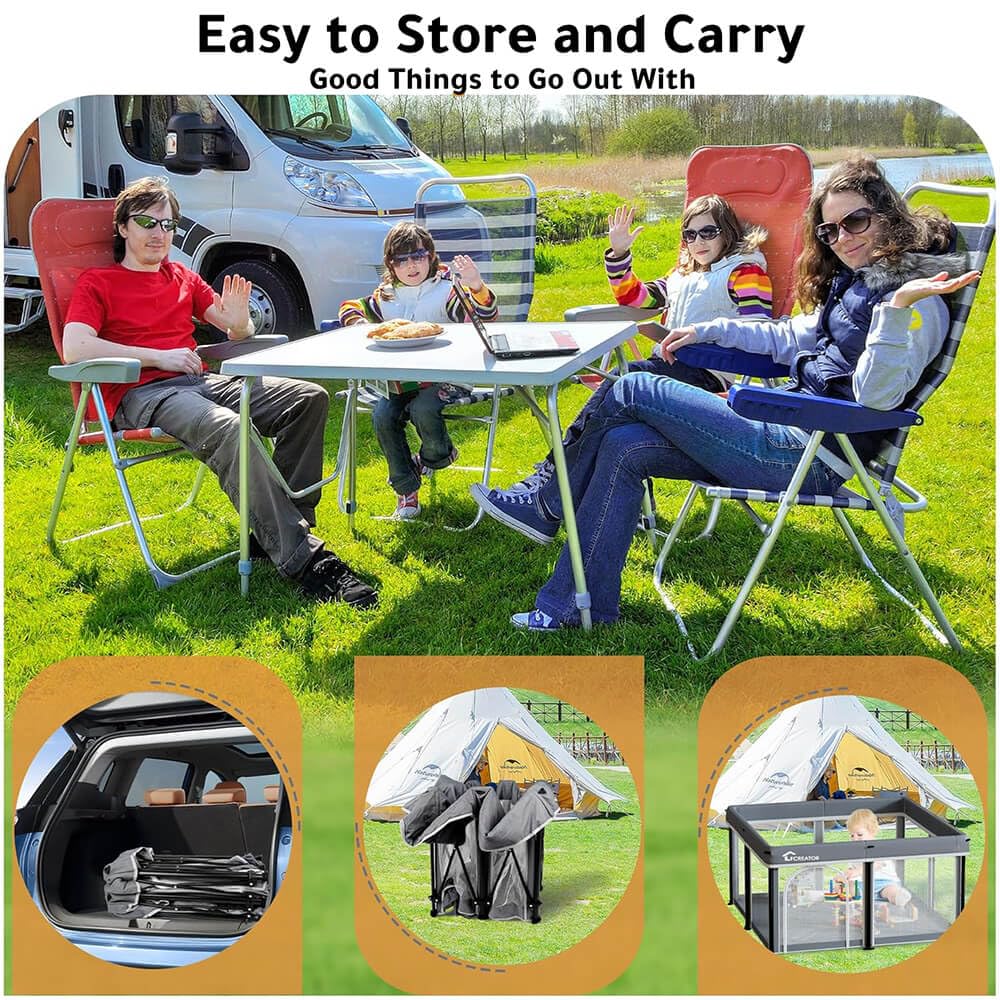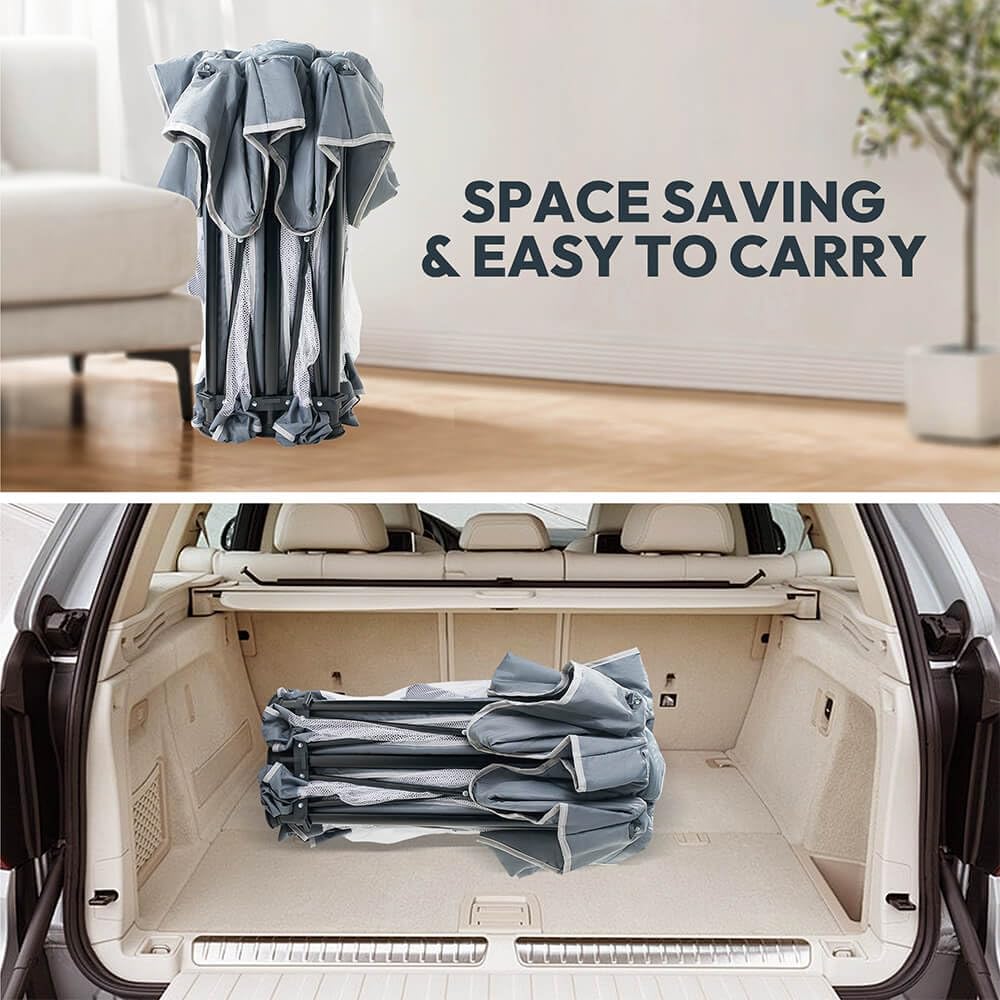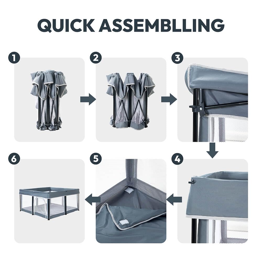 تتميّز الحظيرة بتصميم لا يحتاج إلى تركيب، حيث يمكن فتحها خلال ثوانٍ وطيّها بسرعة للتخزين أو السفر. يضيف بساط اللعب الناعم راحة إضافية وحماية أفضل، بينما تجعل حقيبة الحمل المحمولة عملية النقل سهلة للغاية — مثالية للرحلات العائلية، الزيارات، أو الاستخدام الخارجي.