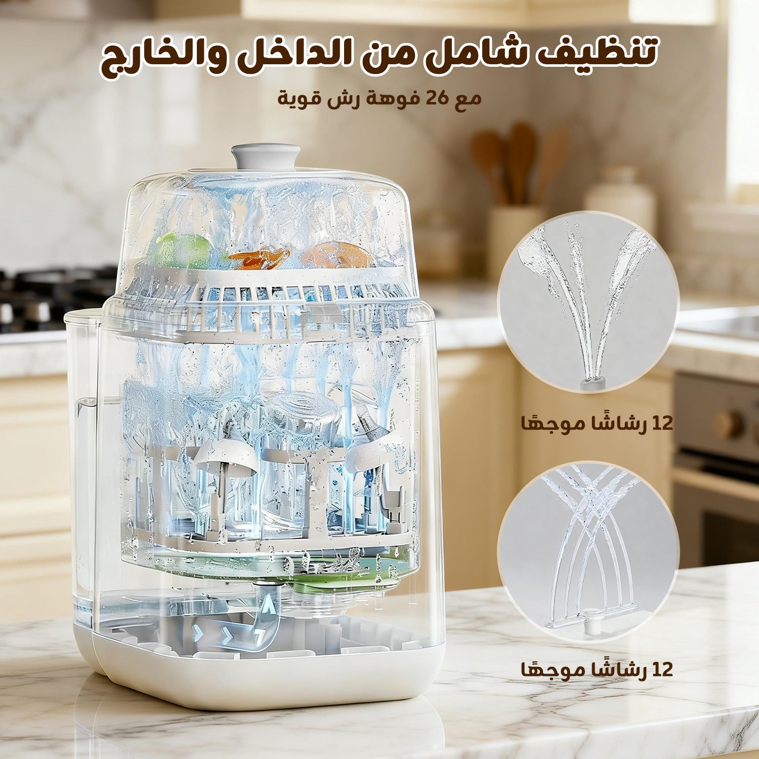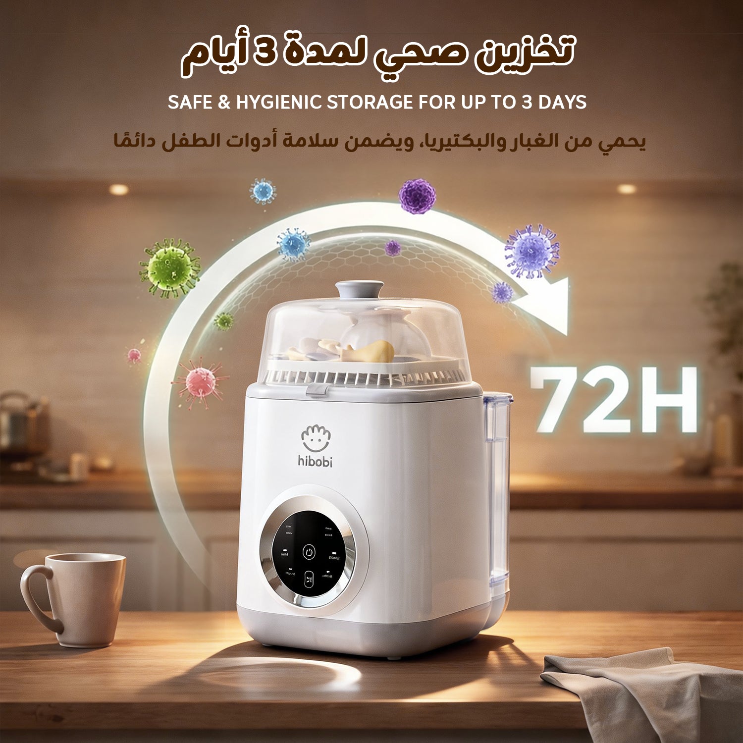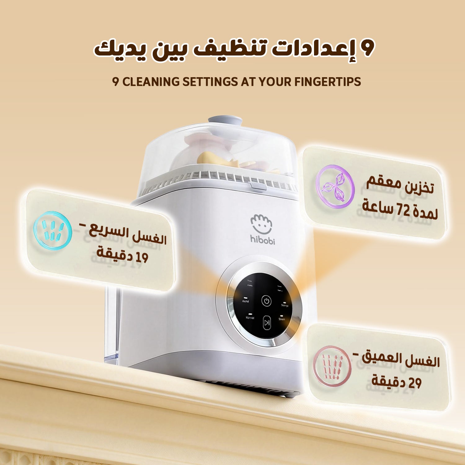 جهاز غسل وتعقيم وتجفيف رضّاعات الأطفال، مع وضعَي غسيل، يدعم تخزينًا نظيفًا حتى 72 ساعة، مناسب للرضّاعات والحلمات وأجزاء مضخات الحليب، يوفّر الوقت والجهد – أساسي للعائلات مع حديثي الولادة
