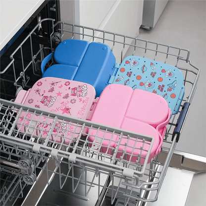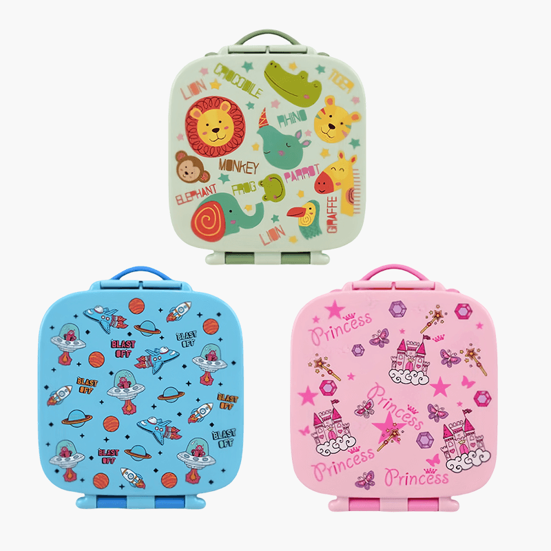 يتوفر صندوق الطعام بثلاثة ألوان للاختيار من بينها: الأزرق، الأخضر والوردي. وكل لون مزين بأنماط جميلة تشمل الديناصورات، وحوريات البحر، ووحيد القرن، مما يجعله مناسبًا للأولاد والبنات.
